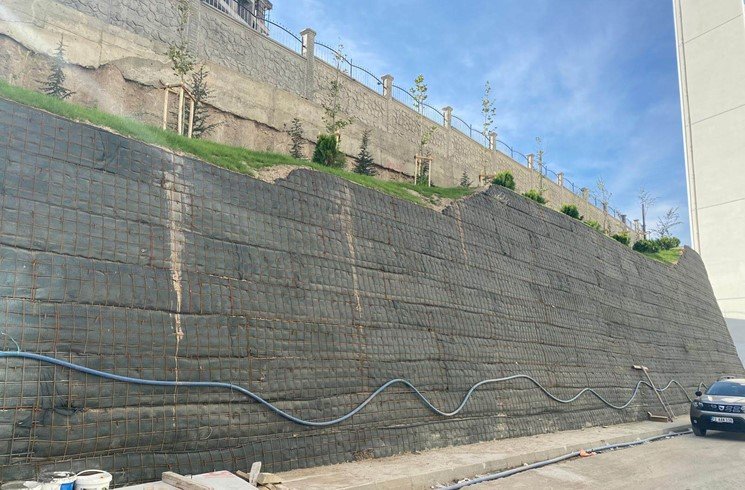 Batman devlet hastanesi inşaatı işi kapsamında hastanenin çevre duvarları için geosentetik donatılı yeşillenebilir istinat duvarları tercih edilmiştir.