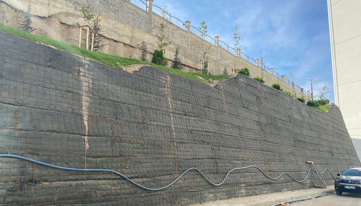 Projenin güvenli bir şekilde tamamlanabilmesi için geosentetik donatılı istinat duvarı sistemi tercih edilmiş olup, duvar yüksekliği 3 metre ile 12 m arasında değişiklik göstermektedir. Geosentetik donatılı duvar sistemleri ön cephesinde kullanılan cephe elemanına göre isimlendirilmekte olup, projemizde çelik hasır ve toprak tutucu Geotex malzemesi kullanılarak yeşillenebilir istinat duvarı yapılmıştır. Duvar sisteminde donatı olarak Low&Bonar firmasının üretmiş olduğu 100/30 kN/m çekme mukavemetine sahip Geogrid ürünleri tercih edilmiş, duvarın arka yüzeyinde oluşturulan drenaj hatlarında ise drenaj çakılının tıkanmaması için TechTex DC 12 Örgüsüz Geotekstil ürünü kullanılmıştır.